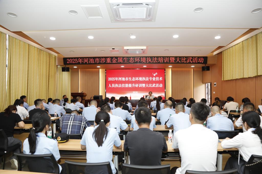 由河池市总工会、市生态环境局联合举办,河池学院化学与生物工程学院承办的2025年河池市生态环境执法专业技术人员执法技能提升研训活动,于8月至9月间,在河池学院举行。该活动分环境执法知识竞赛、执法人员环境执法专业技能提升研训与大比武、优秀环境执法人员个性化执法技能提升研训三个阶段进行。市生态环境局局长左钢在开幕致辞中表示:这次大比武活动以‘以训促学、以赛促练’为目标,目的是激发执法人员的积极性与主动性,有效提升执法队伍的专业素养和实战能力。