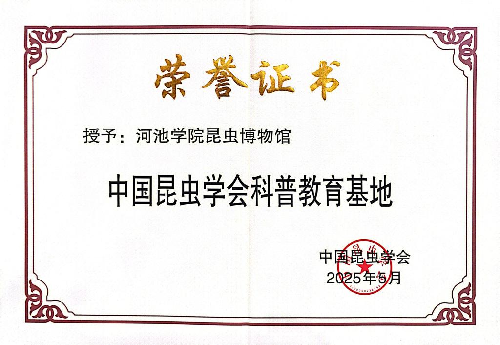 8月23日,河池学院昆虫博物馆(河池学院动植物与蚕桑科技馆)凭借其在科普教育领域的突出贡献,成功通过中国昆虫学会的严格评审,荣获"中国昆虫学会科普教育基地"称号。这是该馆自成立以来首次获得国家级荣誉称号,标志着其科普工作向前迈出了重要的一步。
